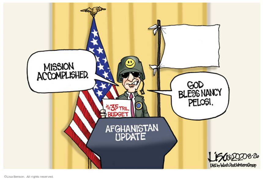 AND CONSERVATIVE CARTOONIST CARTOONISTS MICHAEL RAMIREZ AND LISA BENSON WERE FIRST TO REMEMBER GEORGE W. BUSH’S “MISSION ACCOMPLISHED THEME.